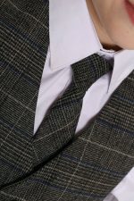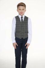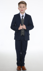 This Stylish navy suit is incredibly eye catching with its Chequered Waistcoat and matching tie. The design of the waistcoat has various lines of White and Grey which makes this waistcoat the dominant piece of the suit. Subtle hints of blue running throughout the pattern compliment the navy jacket and trousers. The whole suit is finished off with a crisp white shirt