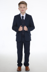 This Stylish Navy suit is incredibly eye catching with its Chequered Waistcoat and matching tie. The design of the waistcoat has various lines of White and Grey which makes this waistcoat the dominant piece of the suit. Subtle hints of red running throughout the pattern compliment the navy jacket and trousers. The whole suit is finished off with a crisp white shirt