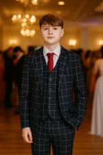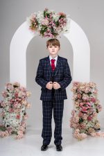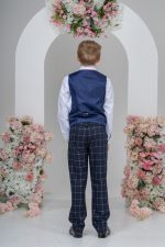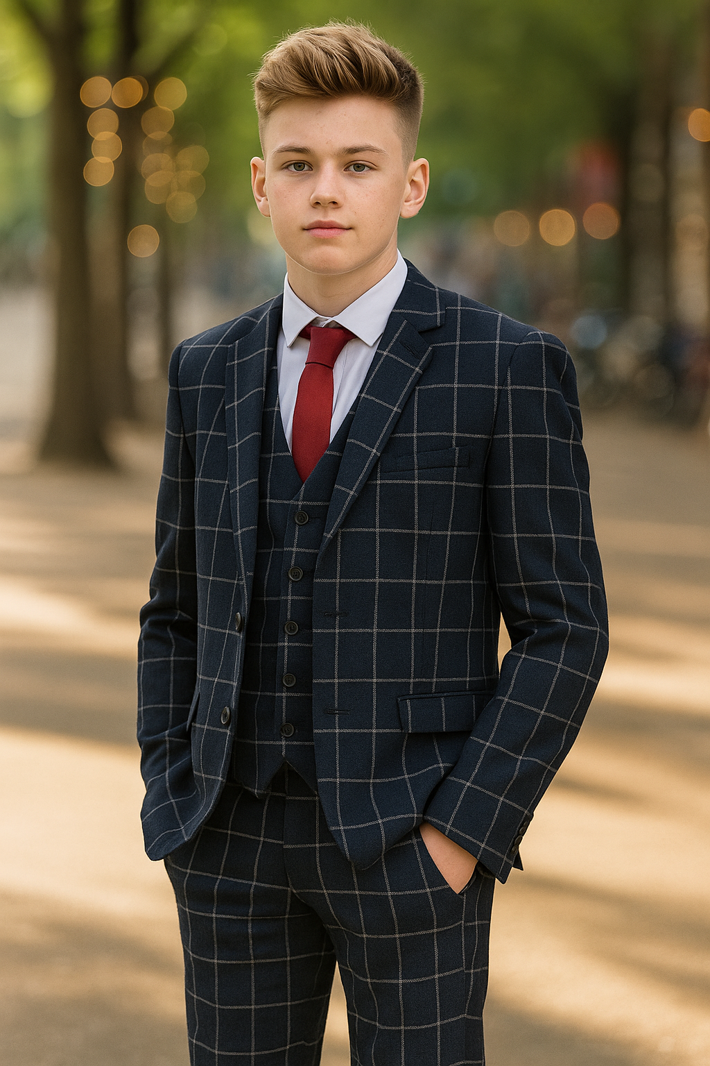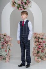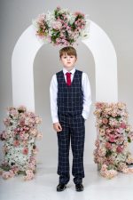 - Waistcoat: A navy and white check waistcoat to match the trousers and jacket.