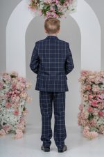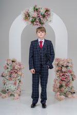 The 5-piece navy with white check suit includes matching trousers, shirt, waistcoat, jacket, and a burgundy tie. A perfect choice for formal occasions.
