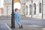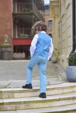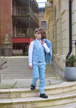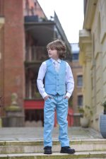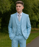This suit is complete with a slick 2 button sky blue suit jacket, a matching fully lined blue waistcoat with an adjustable clasp for sizing, a white full sleeved collar shirt, steel blue elasticated trousers and a plain grey tie for that final touch