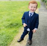 - Royal blue elasticated trousers and a matching blue dot tie for that final touch.
