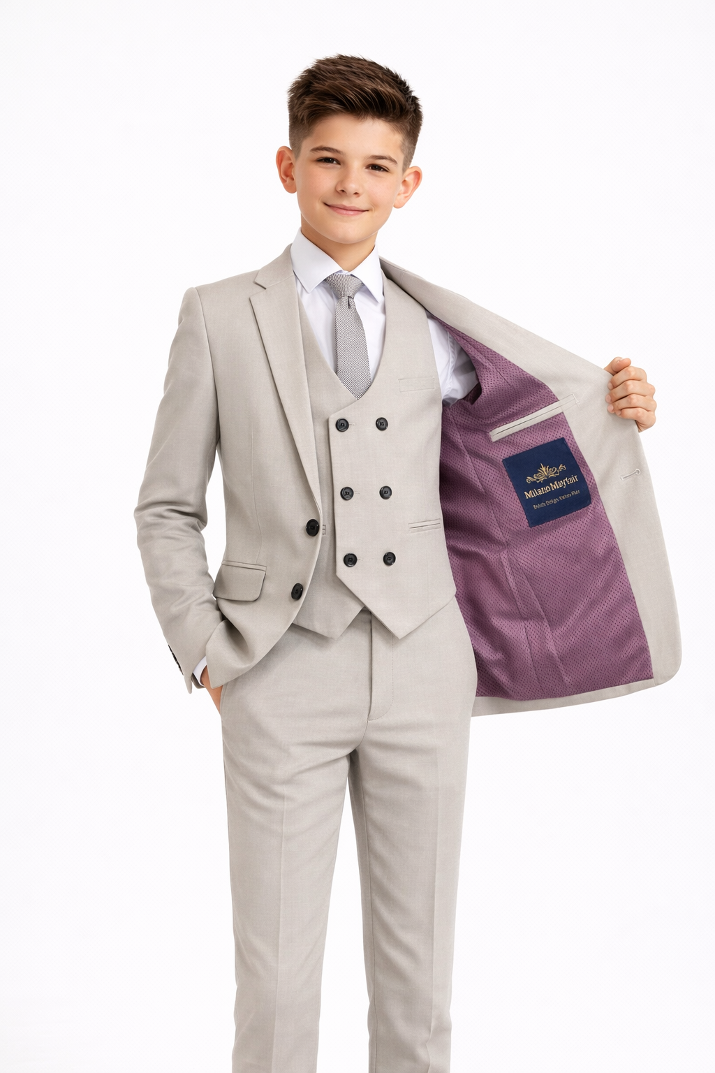 A premium luxury suit by designers Milano mayfair. This complete 5 piece slim fit suit comes with a 2 Button Jacket, trousers with adjustable waist, matching 4 button waistcoat, crisp white shirt and a tie to complement the suit. Make your little gent look stunning and make every moment memorable with this suit.