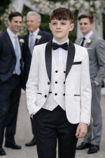 A premium luxury suit by designers Milano Mayfair. This complete 5 piece slim fit suit comes with a 2 White Button Jacket, trousers with adjustable waist, matching 4 button waistcoat, crisp white shirt and a bow tie to complement the suit. Make your little gent look stunning and make every moment memorable with this suit. This premium suit comes in a Milano Mayfair suit bag.