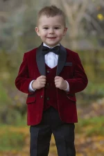 A premium luxury suit by designers Milano Mayfair. This complete 5 piece slim fit suit comes with a 2 Velvet Button Jacket, trousers with adjustable waist, matching 4 button waistcoat, crisp white shirt and a bow tie to complement the suit. Make your little gent look stunning and make every moment memorable with this suit. This premium suit comes in a Milano Mayfair suit bag