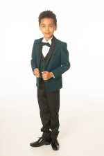 Be sure to make a bold statement with this boys dazzling Emerald Green Glitter Tuxedo Suit. This boys full 5 piece suit comes complete with jacket, shirt, waistcoat, trousers and bow tie.