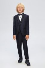 Boys Navy Tuxedo Suit Glitter Jacket. Be sure to make a bold statement with this boys dazzling navy Glitter Tuxedo Suit. This boys full 5 piece suit is a true statement piece made to the highest quality.