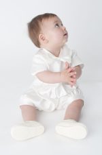 This Christening suit consists of a satin look baby grow that buttons at the bottom. The romper also features 3 buttons, a bow tie and cummerbund, resulting in a romper that resembles the most handsome of outfits for your young gentlemen. A matching 4 button plain jacket finishes off this outfit perfectly. This suit is available in White or Cream.