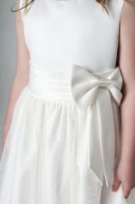 - Bodice: The dress features a fitted bodice that offers a sleek and elegant silhouette, seamlessly complementing the layered design of the skirt. The ivory-coloured sash at the waist adds a refined touch and is finished with a bow at the back, accentuating the waistline gracefully.