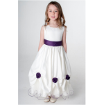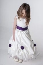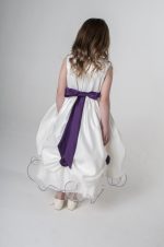 - Bodice: The ivory bodice is beautifully adorned with a purple layered waist sash, adding a pop of colour.