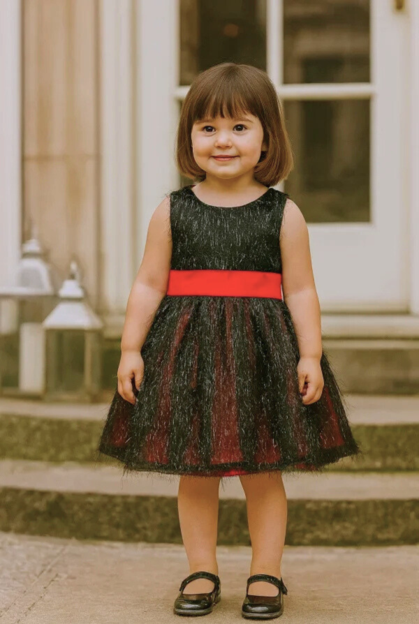 Make every special occasion unforgettable with this stunning toddler girls’ party dress. Designed with a luxurious black shimmer bodice and an eye-catching red satin waistband, this dress captures the perfect balance of elegance and festive charm. The voluminous black and red layered tulle skirt adds movement and sparkle, making it ideal for twirling at parties and family events.