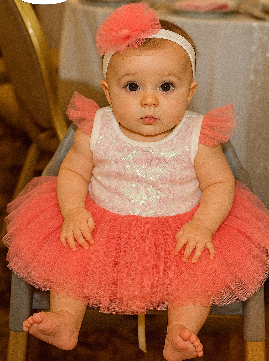 The full layered tulle skirt has a bright coral colour that creates a fun and eye-catching look, perfect for celebrations and photographs. The outfit is completed with a matching coral bow headband for a coordinated finish. Fully lined and baby-friendly, this dress is ideal for birthdays, weddings, christenings, family gatherings, and special events where your little one deserves to shine.