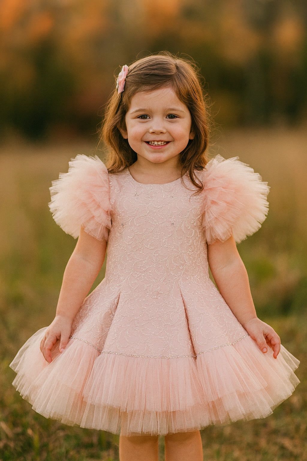 - Hemline: The skirt features a ruffled hemline with pink or white tulle on the edges, enhancing the dress’s dynamic movement and providing a soft, ethereal touch.