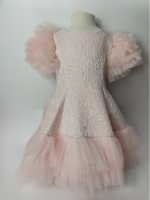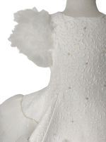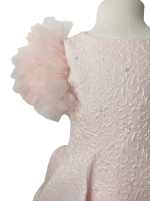 - Bodice: The dress features a sleeveless bodice with an embossed design throughout, adding texture and dimension. This embossed pattern creates a refined, dramatic look in both the pink and white options, providing an elegant yet striking appearance.