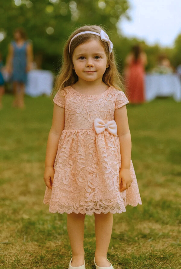 This girls’ peach lace dress is a charming and elegant choice for any special occasion. The dress features a full lace overlay with delicate floral detailing, giving it a classic and timeless look. Cap sleeves and a soft round neckline add comfort while keeping the style refined. A matching peach bow at the waist brings the whole outfit together with a sweet and stylish touch.