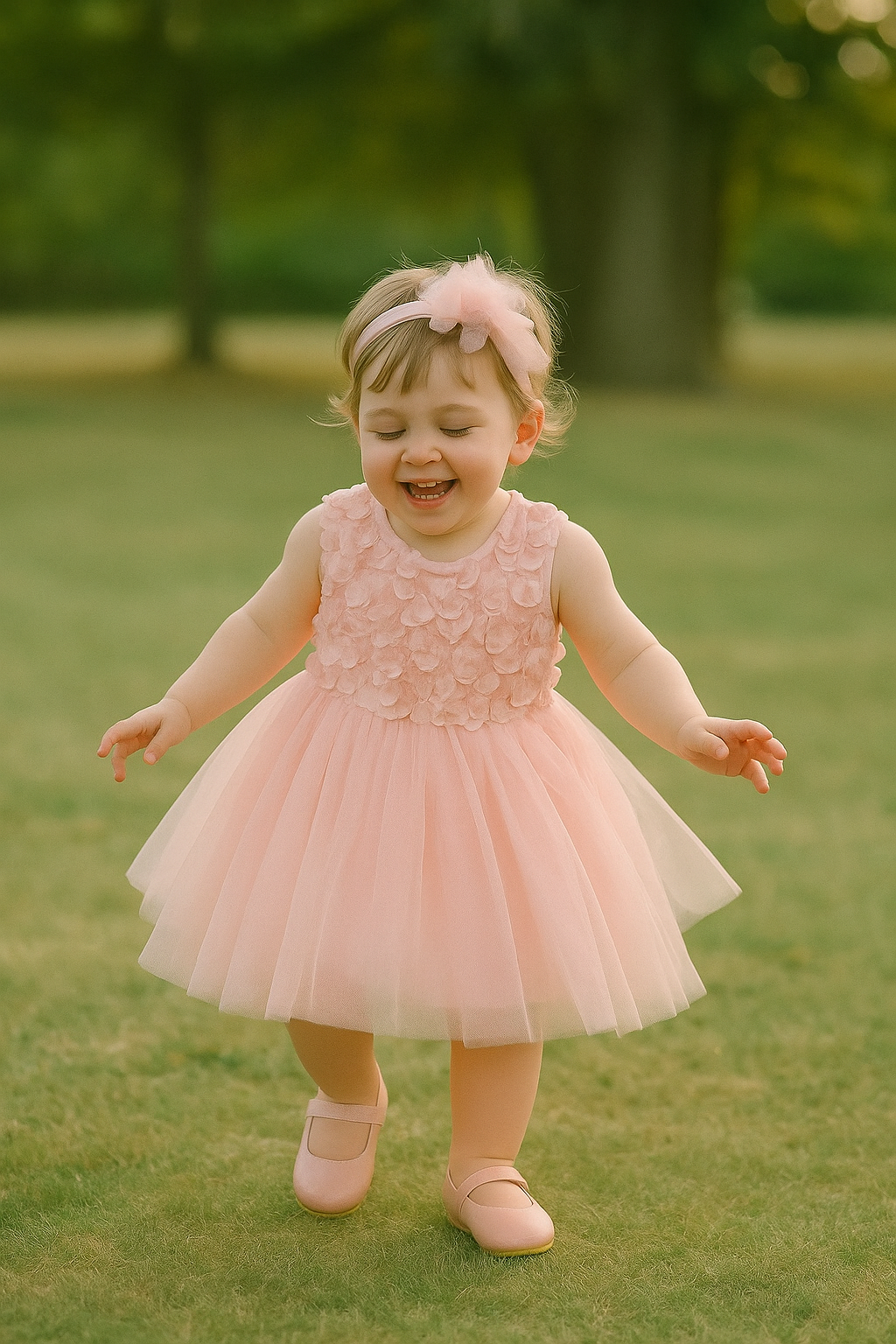 - Accessories: Comes with a matching pink rose headband and pink shoes with flowers adorning the rims.