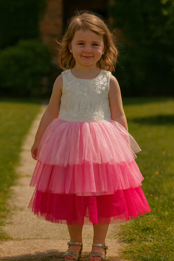 This enchanting toddler girls’ dress is designed to stand out at every special occasion. The top features a soft, elegant white lace bodice, adding a classic touch of charm and comfort. The real showstopper is the gorgeous tiered tulle skirt, blending shades of light pink through to vibrant hot pink in a beautiful ombre effect. Each layer adds fullness, movement, and a fairy-tale feel that little ones love.