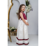 Bodice: The dress features a sleek, sleeveless red satin bodice with white lining, offering a clean and elegant contrast against the ivory skirt.
