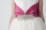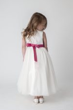 - Waistline: The waist is defined by a vibrant pink sash, which adds a lovely pop of colour to the dress. The sash is adorned with beaded diamante detailing in the middle, bringing an element of sparkle and sophistication. The pink ribbon, which ties at the back, enhances the dress’s feminine appeal and completes the look with a charming bow.