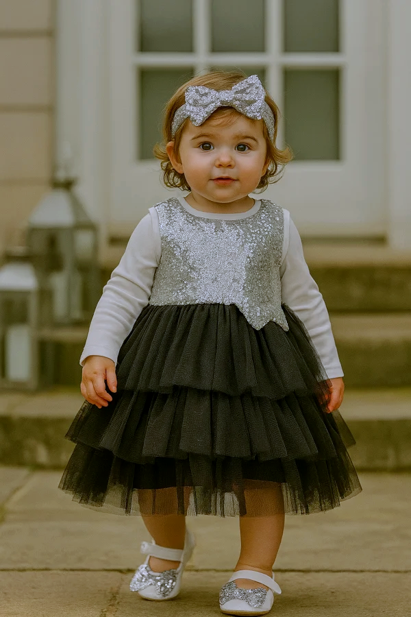 Perfect for birthdays, weddings, holiday parties, family photoshoots, and any event where your little girl deserves to shine. The outfit is completed with a matching silver glitter bow headband, adding the final touch of sparkle. A stylish yet comfortable choice for toddlers, combining durability, elegance, and charm.