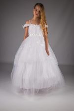 An elegant full-length gown with an off-the-shoulder design, adorned with butterfly embellishments. The satin peplum skirt features embroidered detail and layers of flowing tulle, with a hoop to create a voluminous silhouette.