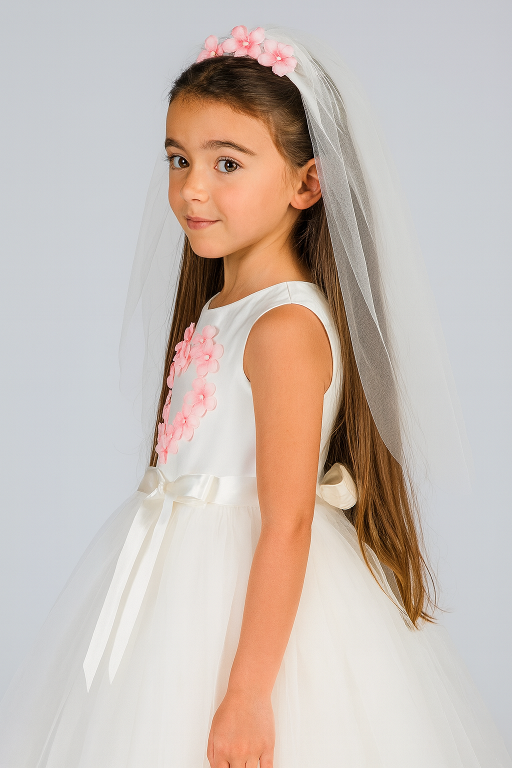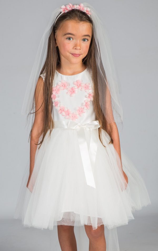 This elegant girls’ white occasion dress is a timeless choice for weddings, communions, and formal celebrations. The sleeveless bodice is decorated with delicate pink floral appliqués arranged in a heart shape, adding a soft and charming touch. A satin ribbon belt ties neatly at the waist, giving the dress a classic and polished finish.