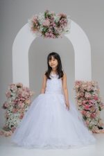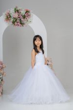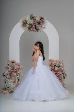 - Skirt: A satin peplum skirt with layers of tulle, creating a flowing silhouette. The dress is equipped with a hoop to add volume, giving the skirt a full, elegant look.