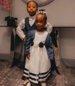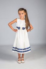 - Back Detail: A large navy bow at the back completes the dress, offering a sweet and feminine finishing touch that adds a touch of grace to the design.
