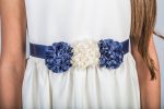 - Waistline: The waist is defined by a navy and white floral sash, adding a charming touch of contrast. The navy satin-like band around the waist enhances the sophisticated and polished look of the dress.