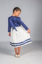 - Skirt: The shin-length skirt is adorned with three delicate navy stripes at the hem, adding a subtle but stylish detail. The flowing design gives it a formal yet playful vibe, perfect for any special event.