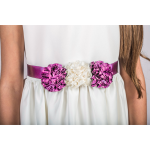 - Waistline: The waist is defined by a pink and white floral sash, adding a touch of charm and sweetness. The pink satin-like band around the waist complements the bodice and balances the design.
