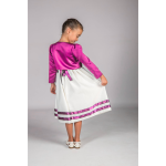 - Skirt: The shin-length skirt is adorned with three delicate pink stripes at the hem, adding a subtle but stylish detail. The flowy design gives it a youthful, playful look that’s perfect for any formal occasion.