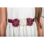 - Waistline: The waist is defined by a wine and white floral sash, adding a beautiful and delicate touch. The wine satin-like band around the waist gives the dress a polished and balanced look.