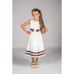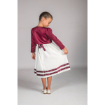 - Skirt: The shin-length skirt is accented with three subtle wine-coloured stripes at the hem, offering a stylish detail that enhances the dress’s formal yet playful appeal. The skirt flows gracefully, perfect for special occasions.