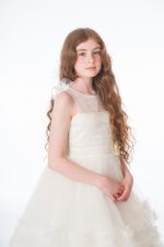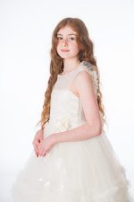 An elegant full length gown designed by Babooni. A glittery sheer neckline leads into a elegant bodice lined across the chest with delicate diamantes. A full length tulle layered skirt with frilly ruffles detailed with beautiful floral appliques. A hoop lines the inside of the bottom of the skirt to enhance the silhouette of the skirt.
