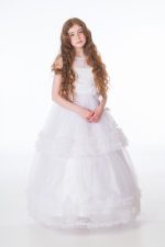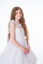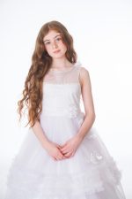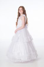 An elegant full length gown designed by Babooni. A glittery sheer neckline leads into a elegant bodice lined across the chest with delicate diamantes. A full length tulle layered skirt with frilly ruffles detailed with beautiful floral appliques. A hoop lines the inside of the bottom of the skirt to enhance the silhouette of the skirt.