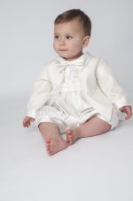 This Christening suit consists of a satin look baby grow that buttons at the bottom. The romper also features 3 buttons,  a bow tie and cummerbund, resulting in a romper that resembles the most handsome of outfits for your young gentlemen.  A matching 4 button diamond stitch jacket finishes off this outfit perfectly. The jacket has a long split tail and folded 3/4 length sleeves as well as 4 show buttons on the front.
